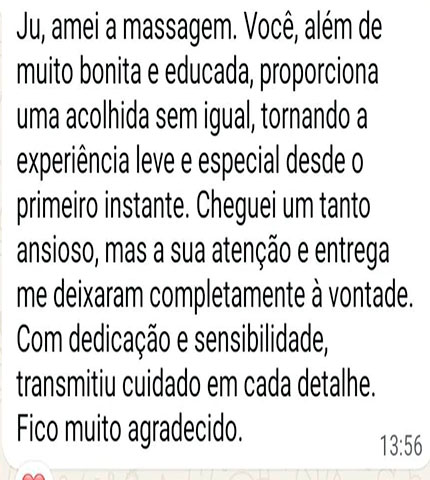 Olá me chamo Jhu Sampaio e o meu trabalho é proporcionar um bom relaxamento e o(a) deixar revigorado(a).